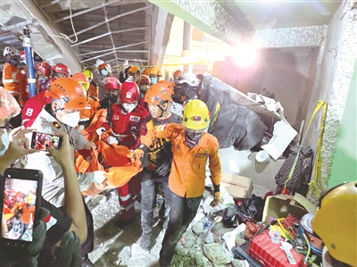 雅加达,10月1日,救援人员在印度尼西亚东爪哇省诗都阿佐县建筑倒塌现场搬运遇难者遗体。