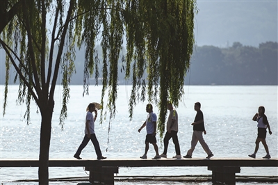 昨天下午,游客顶着高温逛西湖。 记者 陈中秋 摄