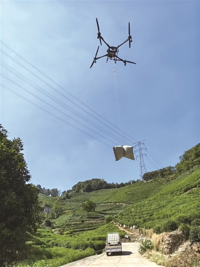 提供无人机运输服务的杭州孝林茶叶专业合作社飞手谭国华介绍,单架无人机每次可承载130斤肥料,往返仅需2-3分钟,日均运输量达7.5吨,目前已为百余户茶农提供服务。