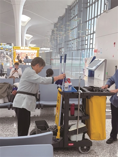 采访最后,洪阿姨说:“我没读过什么书,说得不好,以后要把机场打扫得更干净,让大家都玩得开心。”