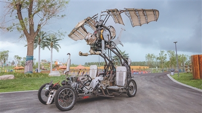 这次亮相的“异外来客”巡游玩具车,位于吴山广场大草坪的“未来公园”,灵感来源于“花神”形象,用架子鼓的零部件和盔甲制作了“飞行的机器人”的形象。“我们设定了可以乘坐三名游客,游客在座位上可以通过物理传动的方式控制机器人的翅膀、手臂等部件运动起来。”