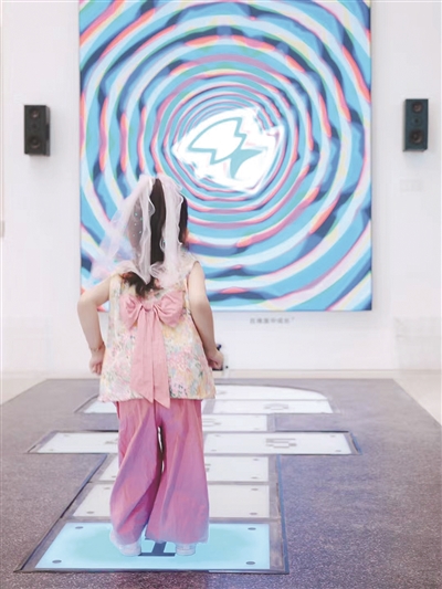 跳入“童年维度”,屏幕上会出现滑梯、云朵的波纹,有轻盈和漂浮之感;跳入“时间维度”,屏幕上就会出现层层叠映的波纹,仿佛在表达“时间不走回头路,总会留下回声”;在“个人维度”,何思琦把图像和摄像头进行了关联,随着体验者随意摆动身体,摄像头能实时捕捉人像,轮廓的波纹也会出现在屏幕上。