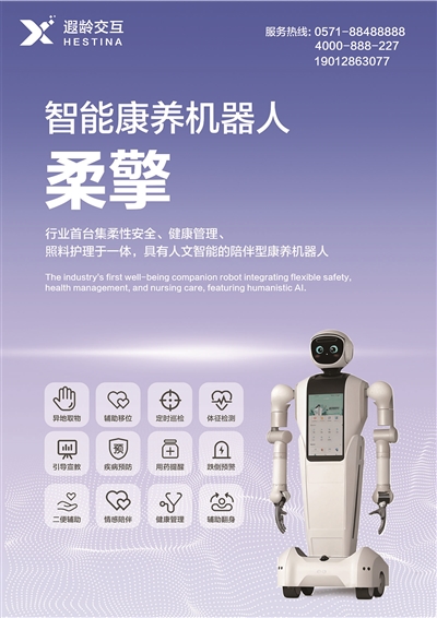 来自杭州遐龄交互智能服务机器人有限公司,全球首发的柔性机械臂可实现安全拥抱互动;额头搭载深度摄像头,支持摔倒检测、用药识别与行为监控,集成情感陪护、政策咨询、健康管理、用药提醒、异地取物、辅助移位、辅助翻身、定时巡检、跌倒预警等多重功能。