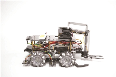 “探界者”智能机器人拓展平台,来自中天模型暨全国科技模型研发中心,学生可通过平台设计属于自己的智能机器人,并通过图形化编程和遥控等方式,让机器人完成自动识别路线行进和避障,机械臂抓取、运输和投递货物,用麦轮全向移动等一系列动作。