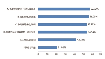 在各项服务中(多选),免费快速充电(手机/车辆)、低价热餐、饮用水的需求最高,临时休息床位/躺椅以及应急药品(如解暑药、创可贴)等需求也超过了50%。