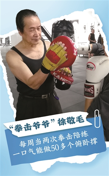 85岁的徐敬毛是杭州拳击界“元老级”人物。14岁练拳,16岁入省队,18岁代表浙江出战全运会,曾任北京亚运会拳击检录组组长,培养出400多名运动员。 如今虽至耄耋,徐老仍每周两次去拳馆当陪练,公益邀约从不推辞。他笑称自己“有三爱”:爱睡觉,爱看都市快报,爱锻炼,现在一口气能做50多个俯卧撑。