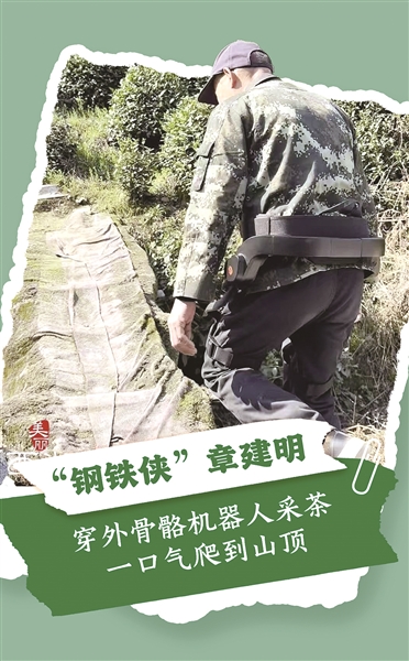 68岁的章建明有50多年采茶经验,是留下街道公认的“茶把式”。两个女儿都已成家的他本可安享晚年,却放不下7亩茶园:“这是茶农的根。” 往年采茶,他背着竹筐一天往返多次十分耗力。今年3月,他第一次穿上了髋部助行外骨骼采茶:“抬腿10厘米就有股力推着向上!以前上山要歇好几次,现在一口气爬到山顶,效率高多了。”