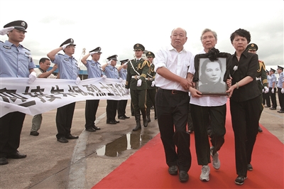 亲属在机场迎接朱枫烈士的骨灰回到故里。 本报资料照片 记者 陈中秋 摄