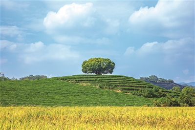 余杭区瓶窑镇,稻田茶园间一棵“孤独”的树。 记者 陈中秋 摄
