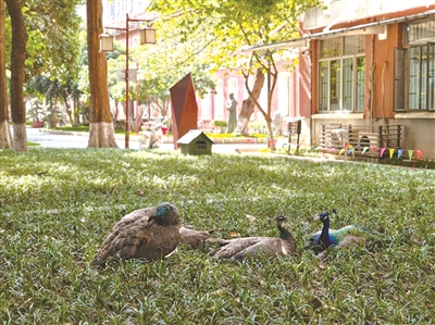 张老师说,这些孔雀是放养的,可以在校园里自由散步,学生们都很喜欢。之前这些孔雀也有过出逃记录,曾飞出校园到旁边的丝绸市场散步,不过它们返巢经验丰富,又自己飞回来了。