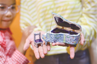这架充满童趣的钢琴上绘有月亮、小鸟、房子等元素,顶盖上嵌有两枚蓝色的爱心。“国内不太能看到这种风格的作品。”张女士说,女儿已学习钢琴两年,购买这架陶瓷钢琴既是缘分,也是激励她继续努力学习的礼物。