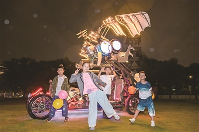 小朋友们在大大大玩具的“异外来客”前合影
