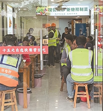汪师傅是安徽阜阳人,在附近工地做架子工,他说最近几乎天天来。同桌一位工友说,他们早上6点上工,上午10点多下工,干工地都是力气活。“我们对吃的要求不高,有油水,量大管饱就行。15元钱,鸡鸭鱼肉都有,老板人不错。”