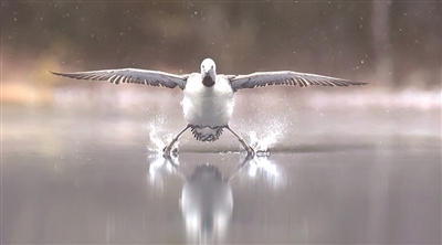 红喉潜鸟正“脚刹”降落在水面