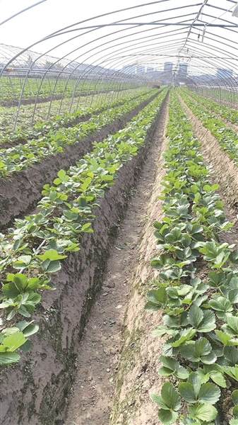 下沙的草莓田一片绿油油,一朵花都找不到。 陆利明 摄