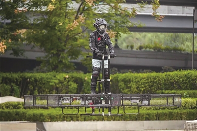 与滑板车双脚前后分开的姿势不同,“空中滑板车”是双脚并立式站姿。驾驶者只需轻握控制杆,前倾或后仰来调整身体重心,就可以调整飞行方向。