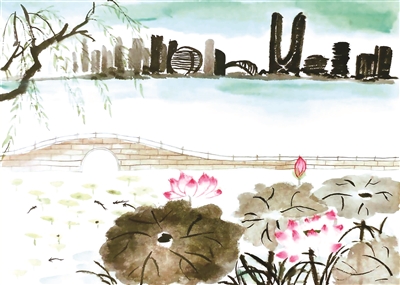 插画狮:《断桥荷韵伴新杭》杭州江南实验学校五(10)班 鲍仲哲