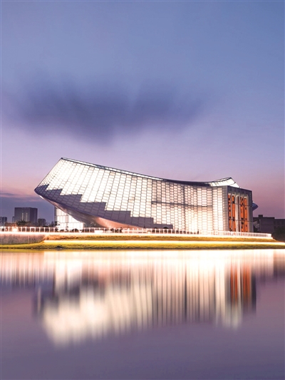 余杭美术馆外形是一个双玉璧环绕的造型,结合3D打印的玉石幕墙,让“玉见未来”全息装置与水韵良渚音乐喷泉相映成趣,实现传统文化与现代科技的融合。