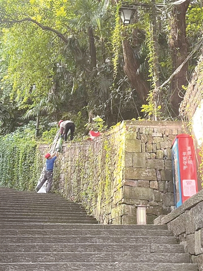 橙友“kzJZZxmz”向橙柿直通车反映:吴山广场胡庆余堂边上往吴山的石板路(吴山瞭望台附近)在整修,修理工人把建筑垃圾往山上扔,没有往山下运,请加强管理。另外,山上锻炼身体的老人,不停地撞树、击打树干,对树生长不利,而且这些树都是年份蛮长的,请予以制止。