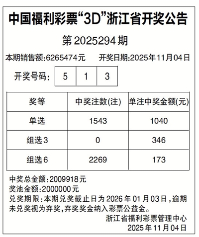 中国福利彩票“3D”浙江省开奖公告
