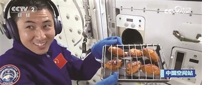 在中国空间站,航天员从包装袋里取出腌制好的鸡翅,在签架上进行固定后放入热风烘烤机,加热28分钟,一盘嗞嗞冒油的奥尔良烤鸡翅就制作出来了。这是人类首次在太空现场制作烧烤。