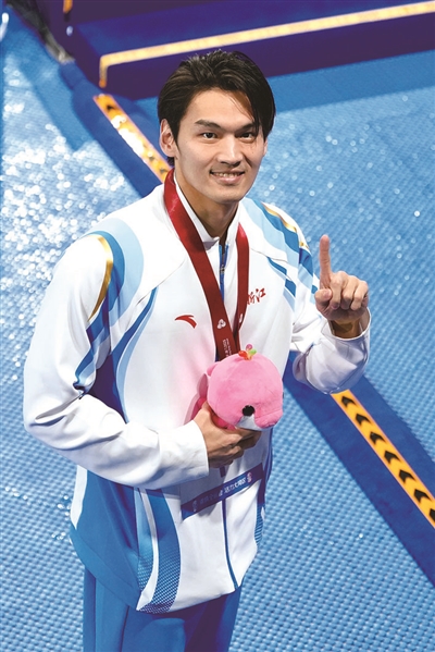 男子200米仰泳决赛中,中国泳坛仰泳第一人、奥运冠军徐嘉余在第5道出发,游出1分56秒63,无悬念夺冠。继男子100米仰泳全运会四连冠后,他又达成了辽宁、天津、陕西、粤港澳全运会男子200米仰泳四连冠的成就。到边后,他比出了“4”的数字。截至目前,徐嘉余已获得全运会金牌15枚,金牌数量在全运史上仅次于汪顺。
