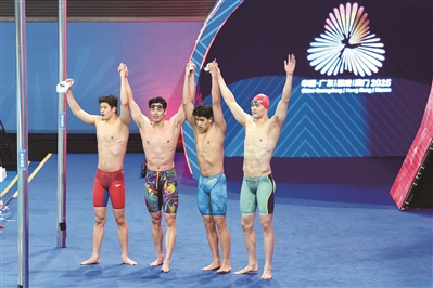 浙江队派出的“绝对王炸”组合:奥运冠军潘展乐、奥运冠军汪顺、亚运冠军费立纬、奥运冠军孙杨。 丁以婕 摄