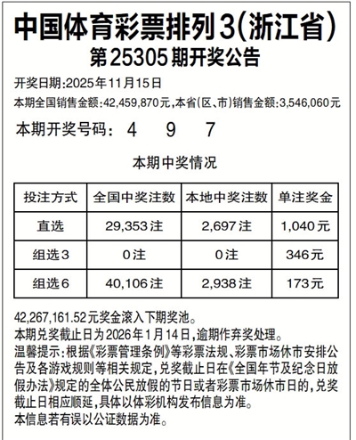 中国体育彩票排列3(浙江省)
