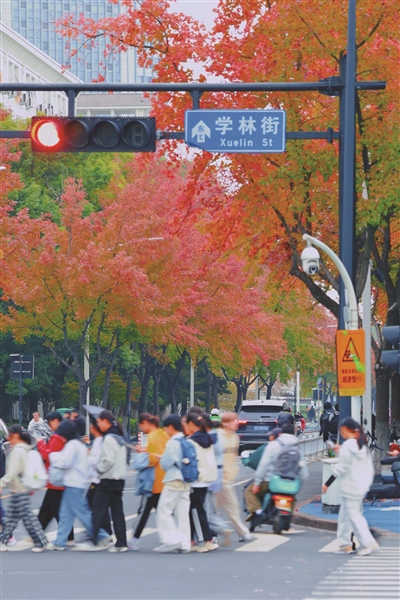 本报讯(记者 王青)随着气温降低,钱塘区学林街两侧的枫香树渐次变红,有的被风吹落在地,铺成一条“小地毯”。这条穿梭于高校间的道路,呈现出“红、黄、绿”三种颜色。