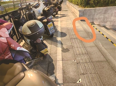 接到反映后,橙柿直通车记者来到迪凯银座,市民中心地铁站N1入口处,人行道上有6个画线的非机动车停车位,离停车位30厘米左右就是下沉广场。