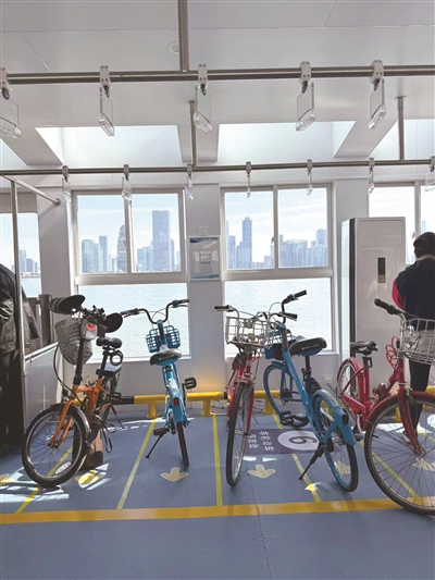 上午9时30分,钱塘江轮渡迎来了一波较大的客流,船舱几乎停满非机动车。船上的安全员说,他负责的这艘船,从早上6时30分到9时30分,有上百名乘客坐船过江,随着钱江三桥封闭施工,渡轮载客量还会有所提升。