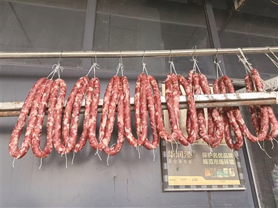 两天时间,于大姐已经灌了两三百斤肉,都是些老客来订,往年最忙的时候一天要灌500多斤。灌好的香肠至少要晾晒两周,这两天降温了,于大姐看了看天气预报,到月底都没什么雨,很适合晾香肠。