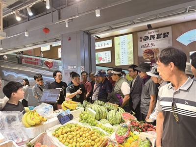 今年7月14日,一支韩国旅游团来参观,韩国客人在水果摊前兴致盎然。 受访者供图