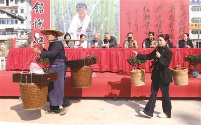 杨倡春和女儿杨铭悦挑着“鸡毛换糖”的担子,摇起了古朴的拨浪鼓。