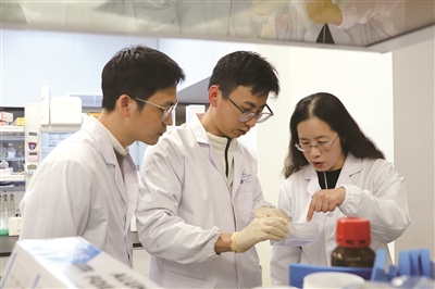 何茂洲、蔡恒、吴蓓丽(从左到右)在实验台前讨论