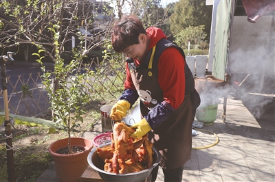 丁兰街道皋城村,很多原住民一到冬天就要做熏鸡,只不过很多是做来自己吃或送人。除了叶爱娥家,还有一些农家乐也会做熏鸡售卖,例如竹缘山庄也已经做好今年的第一批熏鸡了。