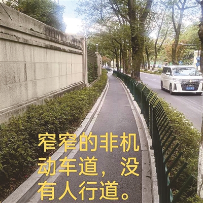 余杭区良渚街道回复:该道路原为中灵线,是县道,故无人行道设置。街道于2022年底对该段道路进行改造,因道路两侧均为已建小区,道路调整空间极为有限。橙友反映位置为劝学里小区西侧,上传照片非机动车道东侧绿化带均为小区红线范围,无法进行改造施工。(记者 陈彬)