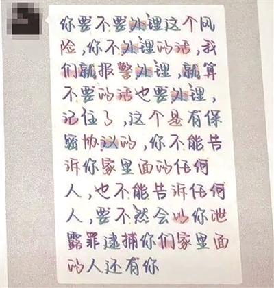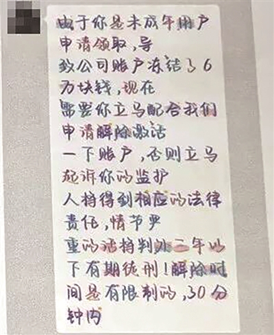 3.恐吓、威胁。当受害人犹豫不决时,骗子用“巨额罚款”“父母要坐牢”等进行恐吓、威胁,让受害人产生恐惧心理,从而配合他们用家长的手机向指定的银行账户转账汇款。