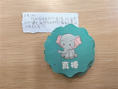 走近才发现,奖卡下压着一张小小的纸条,上面工工整整地写着:“王老师,昨天我被拍的事情,我自罚20个奖卡,再罚今天和下个星期课间不出教室门。”落款是班里一名女生小昕。这时,王老师回想了一下,弄清楚了事情的来龙去脉。
