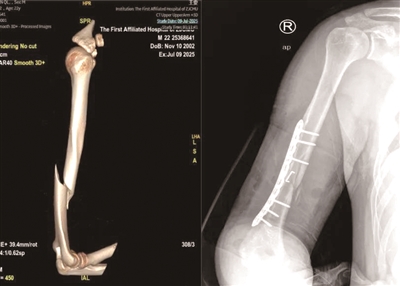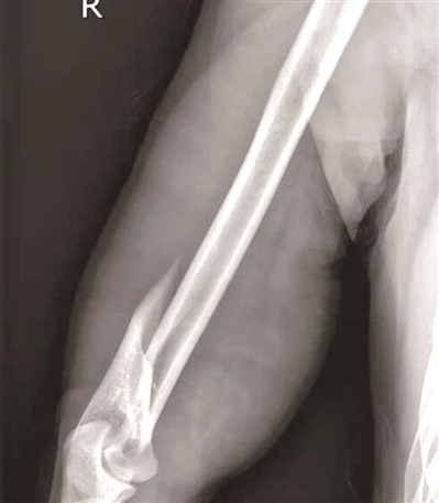 2021年3月的一天,30岁的小马在街边烧烤摊和朋友小聚。酒过三巡和朋友“掰手腕”比力气,小马猛然发力,忽然“咔嚓”一声右臂剧痛,动弹不得。送到杭州市一医院急诊,X光片显示“肱骨干断裂”,断掉的肱骨好似麻花一样,呈现螺旋形状。