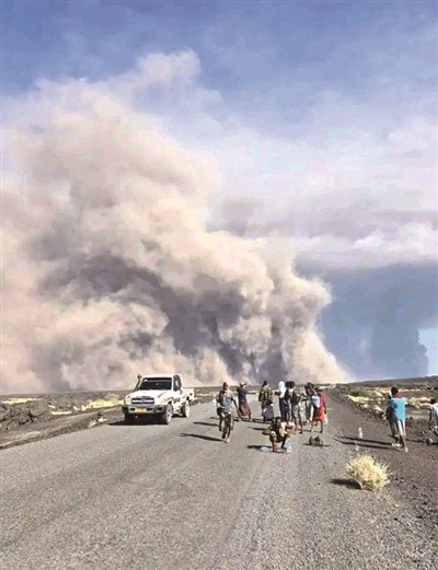 当地时间11月23日中午,埃塞俄比亚东北部埃尔塔阿莱火山附近的海利古比火山发生剧烈喷发,火山灰长时间笼罩天空,附近村庄被火山灰覆盖。卫星图像显示,火山灰云飘过红海上空。