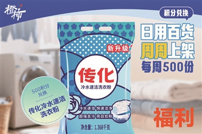 橙柿互动积分商城最新上架500份传化冷水速洁洗衣粉,500积分兑换一袋(1.368千克),兑换成功后,请按页面提示领取。