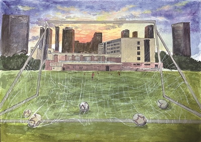 陈诺同学眼中的校园比较特别。他巧妙地透过足球门框展现学校建筑物,远处的高楼倒映在美丽的晚霞中,整个校园都变得温暖起来。草地上还散落着几只足球,那是孩子们运动后留下的快乐痕迹。