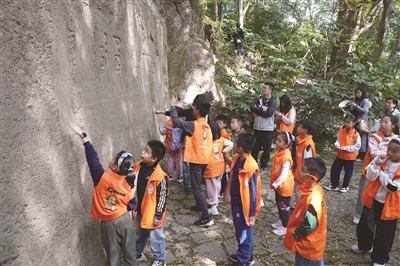 接着,老师又给出下一个“谜题”:找到“玛瑙坡”三个字,提示我们这三个字的旁边配有“吴昌硕时年79岁”的落款。大家找了半天没找到,最后老师只好公布答案:在云泉旁边的石头上!我们仔细一看,字迹几乎快被磨平了,难怪没找到!老师解释说,这个题字延续了吴昌硕“金石入书”的典型风格。三个字笔画繁简不同,譬如“玛”字写得很紧凑,而“坡”字则很有张力。