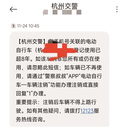 前天,周先生接到杭州交警发的短信通知:您手机号关联的电动车登记使用已超8年,如该车辆非您所有或仍在使用,请忽略此短信,如车辆已不再使用,请通过“警察叔叔”客户端——电动自行车——车辆注销功能办理注销或直接回复“1”办理。通知还提醒,注销后车辆不得上路行驶。