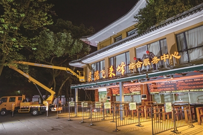 昨晚6点,工作人员拆卸灵隐飞来峰景区售票处的“售票处”标牌,并更换为“综合服务中心”标牌。