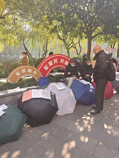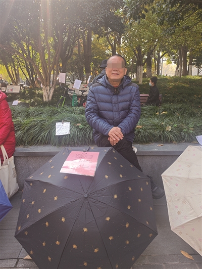 一位来自东阳的大叔坐在花圃边,前面有一把伞,伞上贴着女儿的资料: