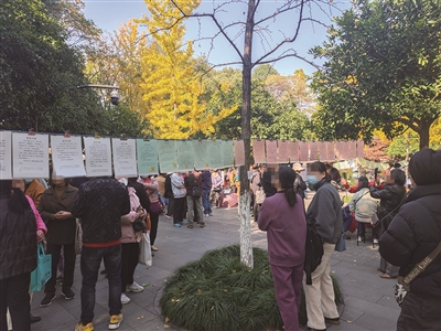 周末阳光晴好,公园空地上格外热闹,树上系着绳,红的是女方资料,绿的是男方资料。草坪上、花圃边、长凳上、伞上、自行车上、老人的挎包上……贴着上百份资料,1985-1995年是主力,他们的资料集中在相亲角的中央,人群也最多,细细看,个个条件都相当优秀,男的帅,踏实上进;女的美,温柔贤淑。身高样貌人品样样都好,学历有硕士、博士,有房有车,有创业的,有企事业单位收入几十万的,也有少数二婚和找老伴的,他们的资料相对摆得边缘。