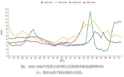 周次 图1 2022-2026年度南方省份哨点医院报告的流感样病例% 注:数据来源于国家级哨点医院。