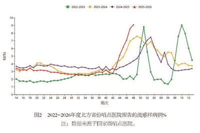 周次 图2 2022-2026年度北方省份哨点医院报告的流感样病例% 注:数据来源于国家级哨点医院。